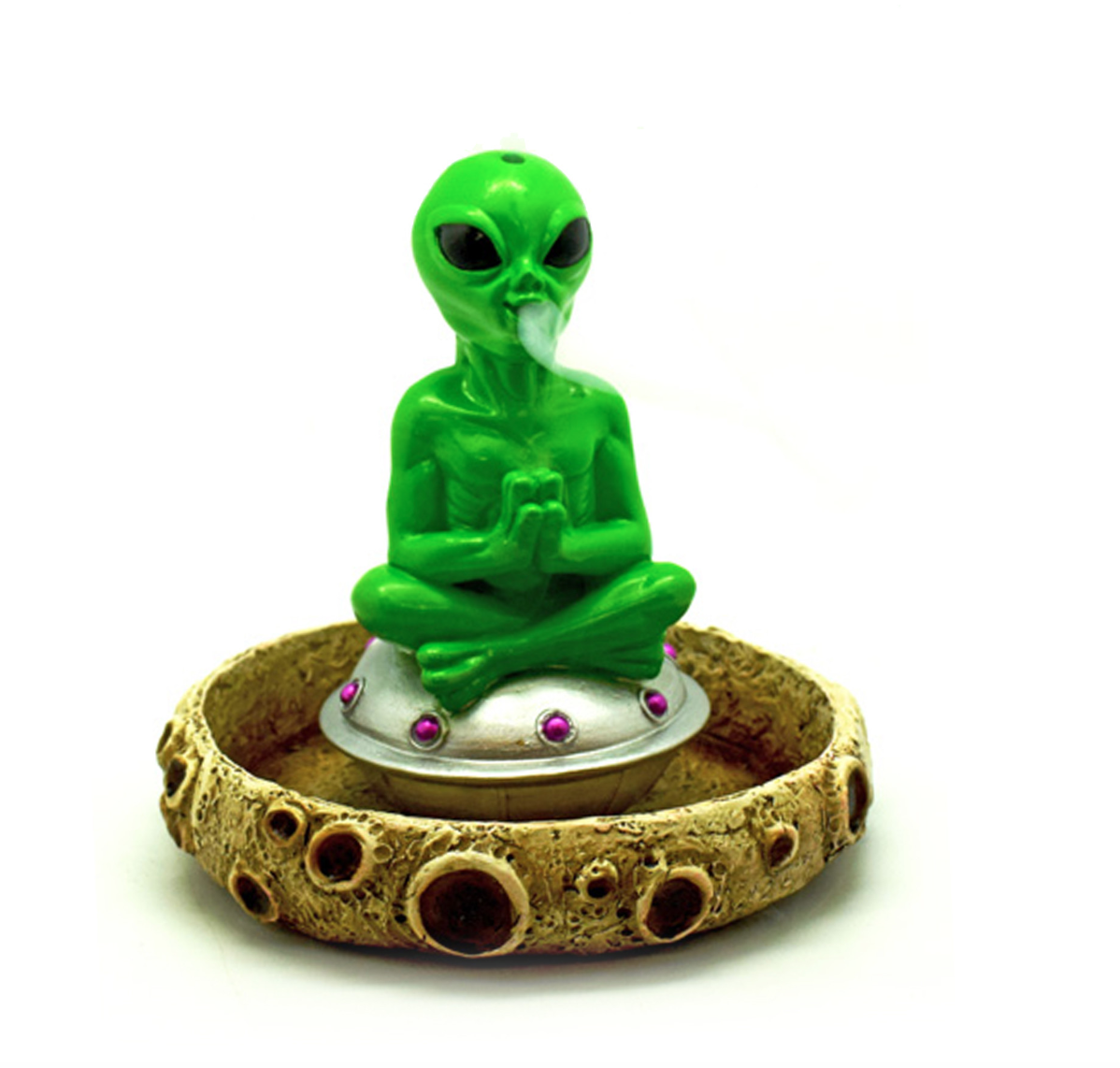 Create a cosmic experience with the Alien Incense Cone Burner. This interstellar invader brings good vibes and peaceful highs with smoke flowing from his mouth and head as he catches ash in his lunar crater.