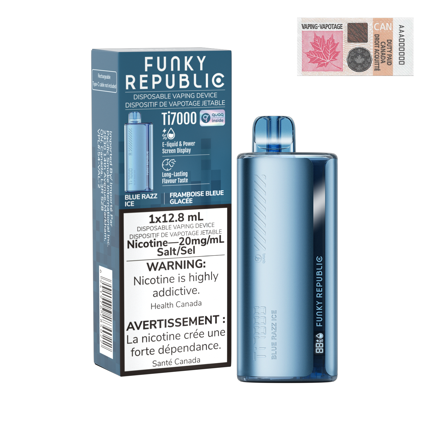 Flavour Profile: Blueberry, Cooling, RaspberryKey Features:Digital smart screen with battery and e-liquid indicatorQUAQ coil for excellent flavour and performanceSleek, stylish metallic finish10 satisfying fruit combinationsFunky Republic TI7000 Disposable Specifications:Size: 100 x 38 x 24 mmBattery: 600 mAhLiquid Volume: 12.8 mL