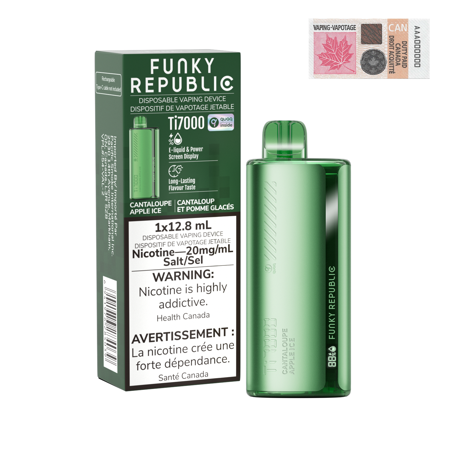 Flavour Profile: Apple, Cantaloupe, CoolingKey Features:Digital smart screen with battery and e-liquid indicatorQUAQ coil for excellent flavour and performanceSleek, stylish metallic finish10 satisfying fruit combinationsFunky Republic TI7000 Disposable Specifications:Size: 100 x 38 x 24 mmBattery: 600 mAhLiquid Volume: 12.8 mL