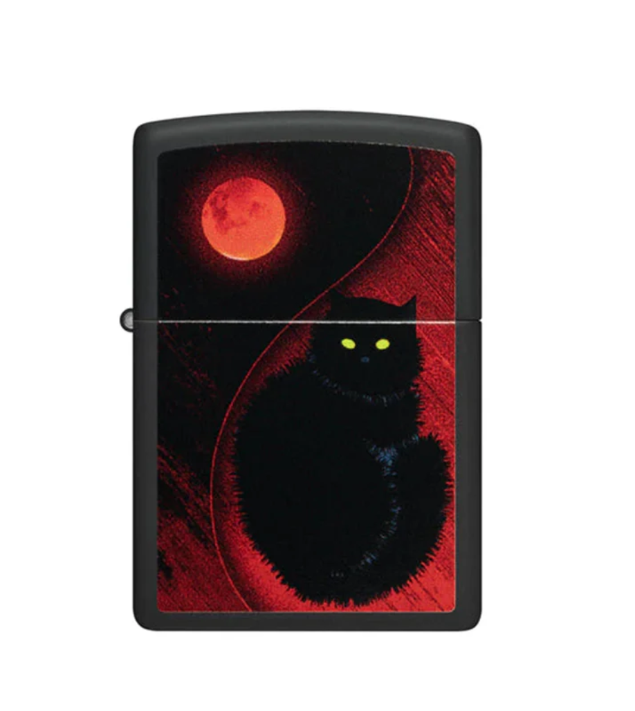 A centuries-old symbol for fortune, the svelte black cat graces the surface of this Black Matte lighter. Glowing yellow eyes punctuate the blood-red and black Color Image design. Comes packaged in a gift box. For optimal performance fill with Zippo lighter fuel.